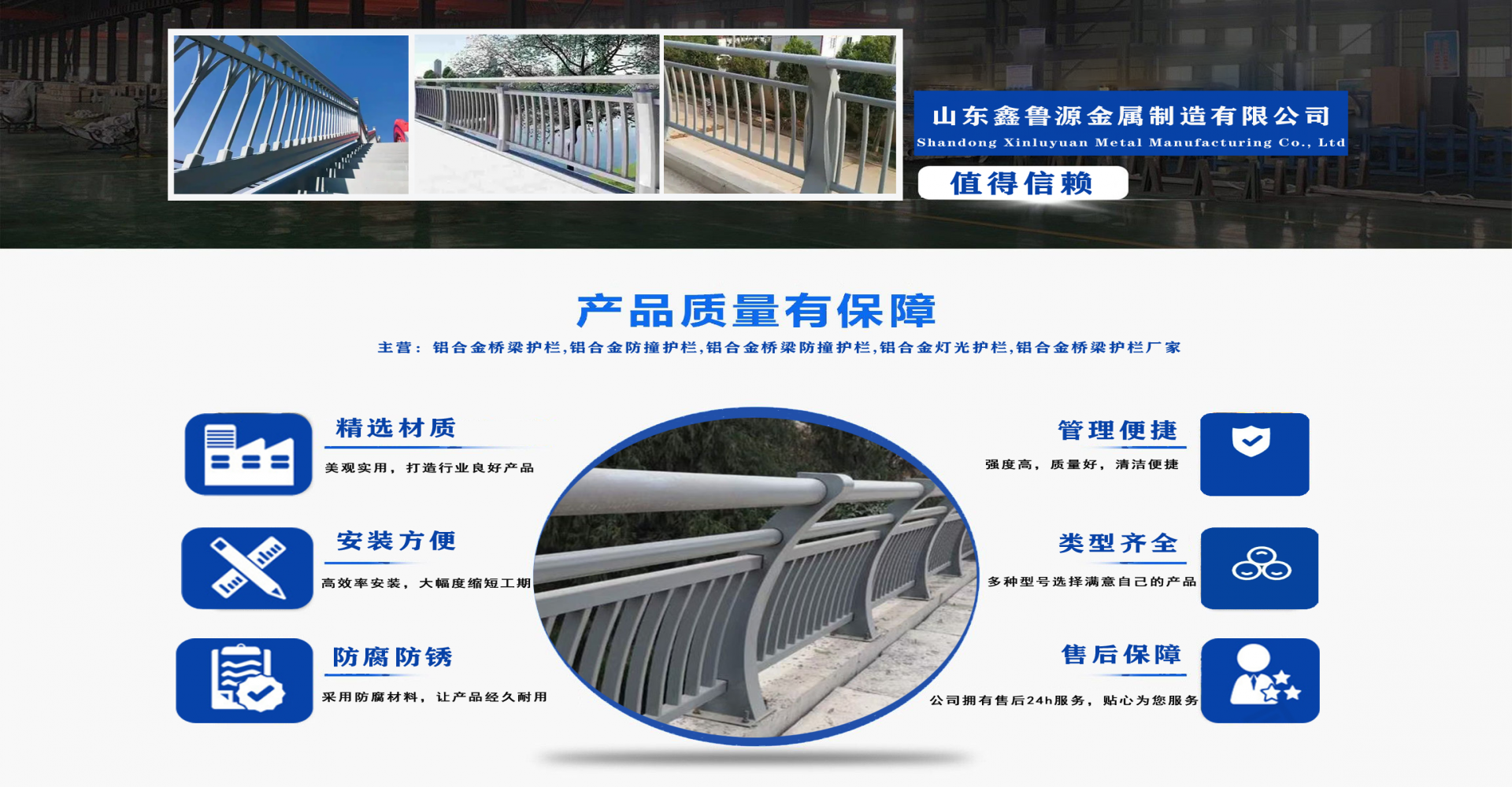 山東鑫魯源金屬制造有限公司主要經營:鋁合金橋梁護欄,鋁合金防撞護欄,鋁合金橋梁防撞護欄,鋁合金燈光護欄,不鋁合金橋梁護欄廠家,環波梁橋梁護欄,環波梁防撞護欄。質量可靠、經濟實用的顯著特點。公司為客戶提供可靠售后保障,堅持“以品質立足、服務求發展”,愿與各界朋友精誠合作、攜手發展!  服務優勢:真誠的服務理念、完善的服務體系。公司專業力量充足;工程案例眾多、從業經驗豐富;公司以可靠質量的產品,合理的價格,完善的售后服務,能夠滿足市場各個企業的需求?! ∑髽I精神:執著追求 持續創新執著追求,就是堅持不懈、堅定從容,專注于自己的事業,把能做的事情做好,不斷克服困難、把握機遇,贏得未來?! 〕掷m創新,就是生命不息、創新不止,通過持續實施技術創新、管理創新、市場創新,獲取持續的競爭優勢。...
